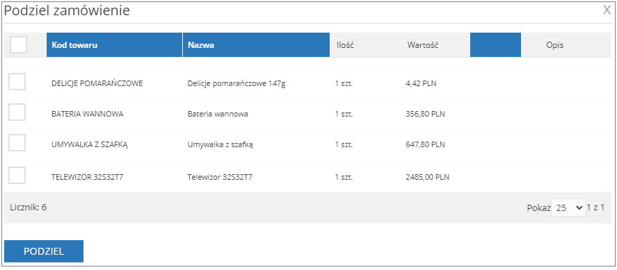 Włączenie parametru dzielenie zamówień umożliwia ręczne dzielenie zamówień.