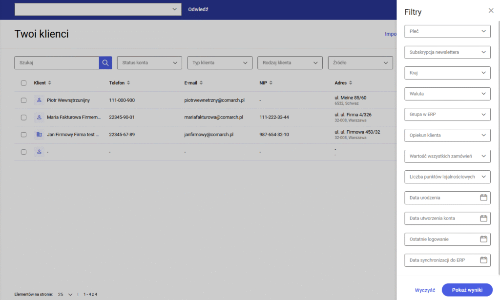 • Inteligentne wyszukiwanie: Wyszukiwarka przeszukuje teraz znacznie więcej pól. Na liście zamówień znajdziesz transakcje po numerze z ERP, telefonie klienta czy numerze źródłowym (np. z Allegro). Na liście klientów wyszukasz ich po numerze NIP, e-mailu czy numerze telefonu.