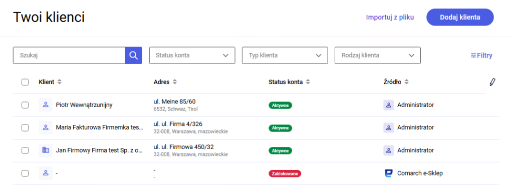 • Etykiety: Wyeliminowaliśmy „ściany tekstu”. Statusy zamówień (np. Zrealizowane, Anulowane) oraz statusy klientów (np. Aktywne, Zablokowane) są teraz prezentowane jako przejrzyste, kolorowe etykiety. Dodatkowo, źródła zamówień i klientów oznaczyliśmy logotypami (np. Allegro, Comarch e-Sklep), co ułatwia szybką identyfikację.