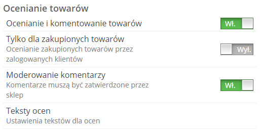 W tej zakładce możliwe jest, wybranie opcji ocenienia i komentowania towarów przez odwiedzających, ocenianie zakupionych towarów przez zalogowanych klientów oraz moderowanie komentarzy – suwak musi być ustawiony w pozycji Tak.