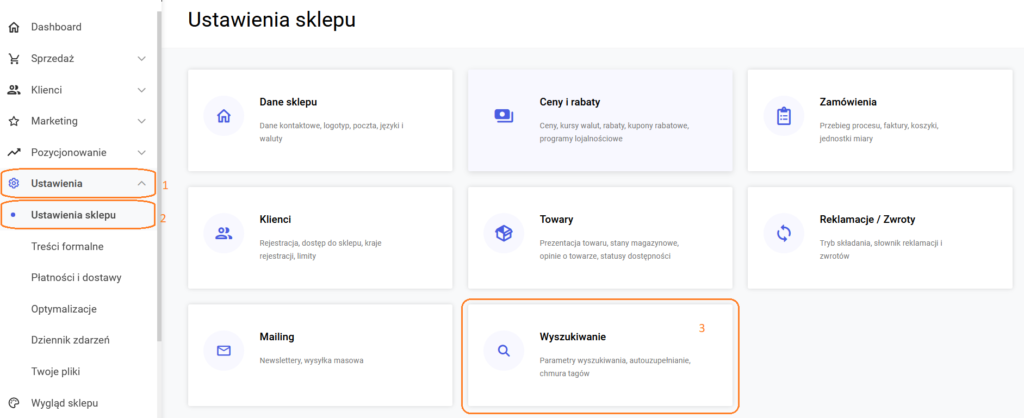 Ustawienia wyszukiwania w Comarch e-Sklep można edytować w panelu administracyjnym, w menu Ustawienia(1) > Ustawienia sklepu(2) > Wyszukiwanie(3).