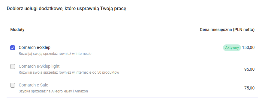 Korzystając z przycisku Zamów e-Sklep Użytkownik zamawia od razu wersję płatną. W takim przypadku co miesiąc dla Użytkownika zostanie wystawiona faktura za użytkowanie e-Sklepu. Istnieje również możliwość zamówienia e-Sklepu z poziomu okna z wyborem usług dodatkowych (Konto: Mój pakiet/ Zmień pakiet). W sekcji usług dodatkowych można wybrać moduł sklepu internetowego w wersji standard lub light, zaznaczając wybraną opcję: