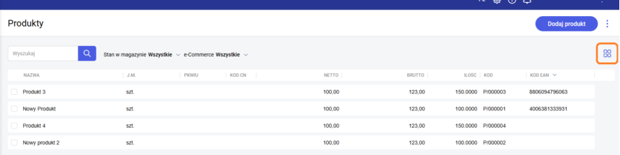 2. Następnie będąc na liście towarów kliknij na ikonkę z kafelkami w prawym górnym rogu: