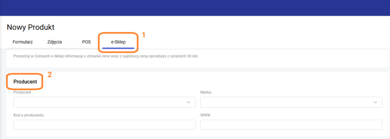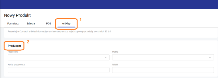 3. Następnie przejdź do zakładki e-Sklep (1) i znajdź sekcję Producent (2):