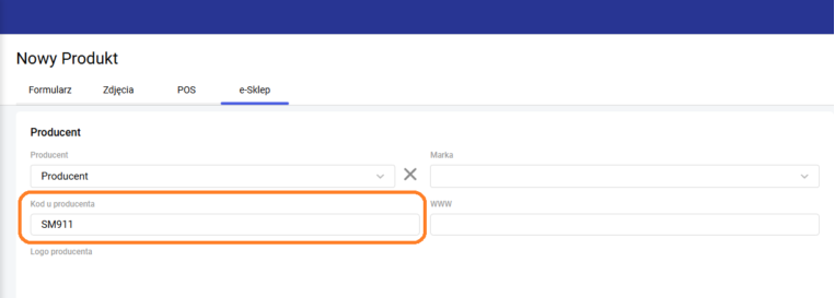 - Kod u producenta. Pole do wpisania kodu towaru u wytwórcy. Dany produkt powinien mieć zawsze ten sam kod producenta, niezależnie sprzedawcy.