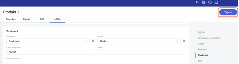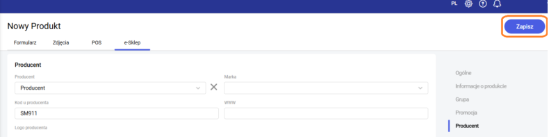 - Producent. osoba lub przedsiębiorstwo, które wyprodukowało dany towar. Możliwość wybrania producenta towaru z listy lub dodanie nowego.