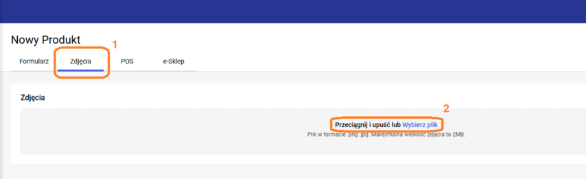 3. Następnie przejdź do zakładki Zdjęcia (1) i kliknij w opcję Przeciągnij i upuść lub Wybierz plik (2). Wybierz plik ze zdjęciem z dysku komputera lub przeciągnij plik w dany obszar: