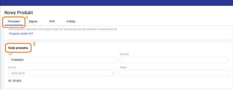 3. Na zakładce Formularz (1) znajdź sekcję Kody produktu (2):