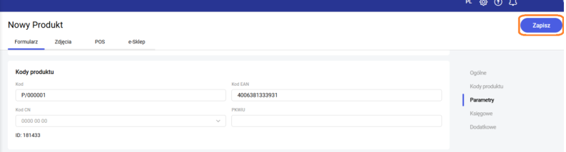 5. Zapisz zmiany na karcie towaru, aby kod EAN został zaktualizowany w systemie ERP. Aby zmiany były widoczne w Twoim e-Sklepie zaktualizuj informacje, przesyłając je do e-Sklepu: