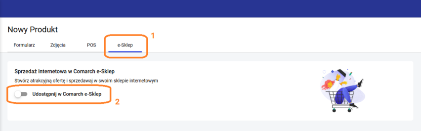 3.Następnie przejdź do zakładki e-Sklep (1) i znajdź sekcję Informacje o produkcie (2):