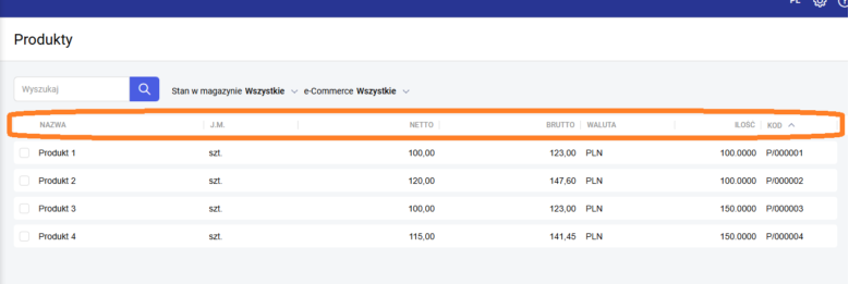 2.Będąc na liście towarów, kliknij prawym przyciskiem myszy na nazwę którejkolwiek kolumny: