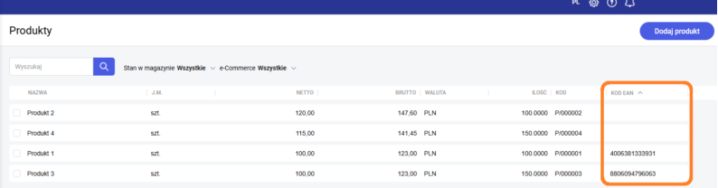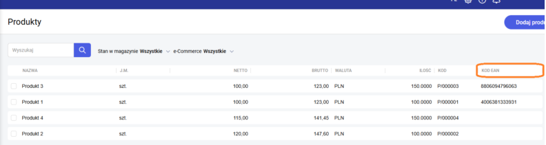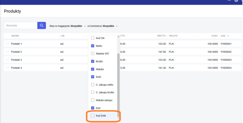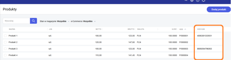 4.Kolumna KOD EAN pojawi się na końcu listy towarów: