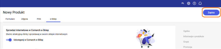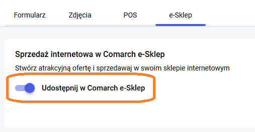 4. Aby zdjęcie było widoczne w e-Sklepie udostępnij produkt przechodząc na zakładkę e-Sklep i kliknij Udostępnij w Comarch e-Sklep: