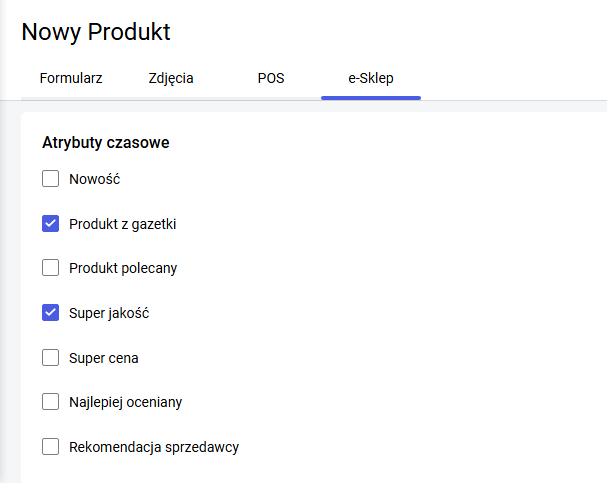 Istnieje możliwość zdefiniowania pewnych atrybutów, którymi będą oznaczane produkty w Comarch e-Sklep jak np.: Nowość, Super jakość, Produkt polecany itp. Aby produkt był oznaczony w wybrany sposób wystarczy zaznaczyć odpowiedni parametr:Po synchronizacji oznaczenie będzie widoczne w sklepie. Do e-Sklepu wysyłane są maksymalnie trzy atrybuty czasowe dla każdego produktu. W przypadku zaznaczenia większej ilości cech – wysłane zostaną trzy pierwsze.