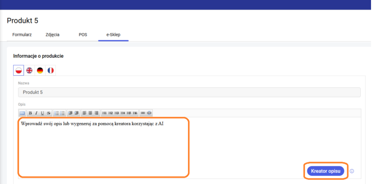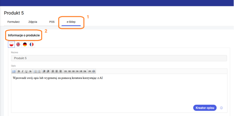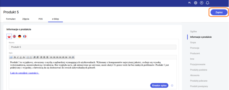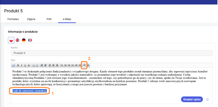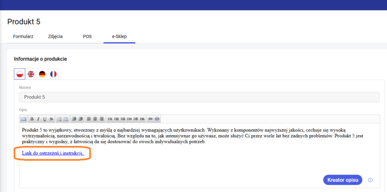 - Opis. Istnieje możliwość zdefiniowania opisu HTML dla produktu. Dostępna jest także opcja Kreatora opisu, który generuje treść na podstawie wprowadzonych danych produktu.