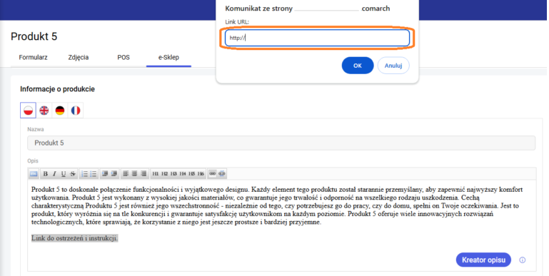 4.Wprowadź opis towaru lub wygeneruj go za pomocą przycisku Kreator opisu > Wygeneruj nowy opis: